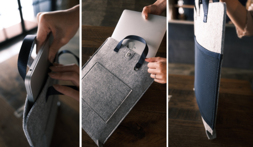 スリムでスマートなラップトップバッグです。 3mmのフェルトが大切なノートパソコンを守ります。 後ろ面にはストレッチメッシュでできたポケットがあり、厚みのあるマウスなど 収納することができます。