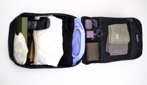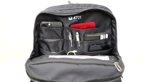 リュックの底で荷物がごちゃつく問題を解消するため、前面を三段構造に設計しました。